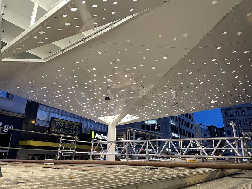 Práce na první etapě zahájil tým egoé v únoru. Zcela hotové jsou nosné konstrukce i podkonstrukce, v těchto dnech dokončujeme montáž podhledů. Ty jsou velmi atypické. Tvoří je hliníkové panely s nepravidelně umístěnými otvory různého průměru. Z vnitřní strany je přichycen mléčný rozptylový polykarbonát. Osvětlení instalované v dutině mezi střešním pláštěm a podhledem tak vytváří nepřehlédnutelný efekt.