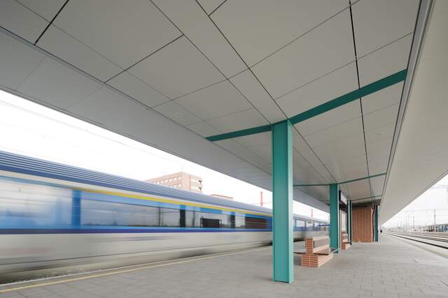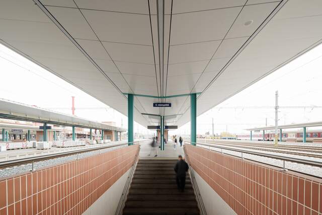 Největší výzvou bylo řešení prvního nástupiště – kopíruje totiž výpravní budovu. Původní zastřešení bylo nepříliš citlivě přisazeno přímo k ní. Nově je prostor mezi zastřešením nástupiště a čelem budovy překlenutý tabulemi bezpečnostního mléčného skla. Spolu s tvarovou jednoduchostí celé konstrukce si tak oba objekty nekonkurují, mají vlastní prostor, harmonicky na sebe navazují.
