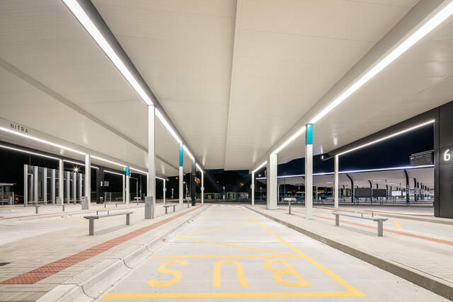 Charakter stavby nádraží v Nitře určují tři mimo půdorys vybíhající černé nosníky v nejvyšších bodech zastřešení. Černé nosné prvky zvýrazňují řád stavby a integrují v sobě veškeré elektrické rozvody. Dva bílé nosníky v nejnižším bodě střechy zase slouží k odvodu vody. Nádraží bylo uvedeno do provozu v roce 2019.
