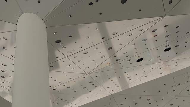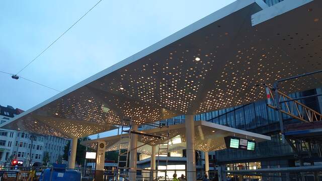 Terminál se skládá z osmi zastřešení, které na první pohled upoutají atypickými podhledy. Tvoří je hliníkové panely s pravidelně umístěnými otvory různého průměru. Z vnitřní strany je přichycen mléčný rozptylový polykarbonát. Osvětlení instalované v dutině mezi střešním pláštěm a podhledem tak vytváří nepřehlédnutelný efekt.