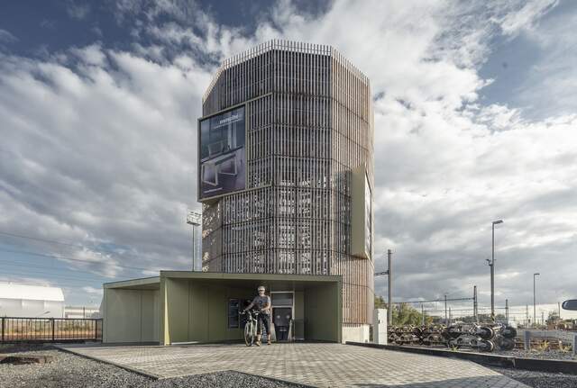 Nová parkovací věž pro kola na čelákovickém nádraží obslouží více než sto cyklistů najednou. Unikátní je opláštění věže dřevěnými lamelami, které vizuálně odlehčilo masivní celek a vytvořilo z něj stavbu zajímavou se současným designem. I v tomto případě jde o výsledek spolupráce kreativního týmu Egoé studia a Egoé plus.
