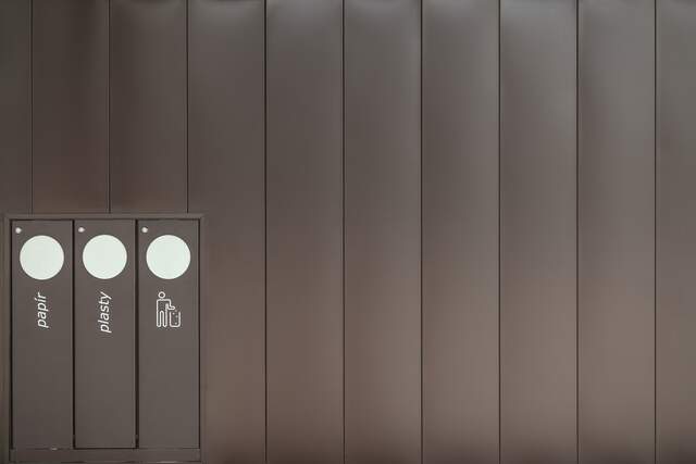 Součástí dodávky byl také mobiliář, konkrétně jde o sérii barka+. Vizuální čistotu stavby podtrhují vestavné prvky jako jsou koše a osvětlení u zastřešení a v krytých prostorech.
