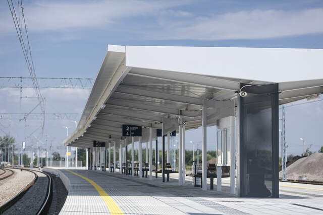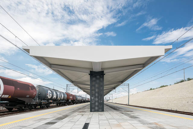 Pro zastřešení nástupišť jsme použili typizované konstrukce řady Tree. Jde o ekonomickou variantu s přiznanou nosnou konstrukcí připomínající strom. V tomto případě byl použit masivní čelní panel, zvláštností je i paraván na čelním nosném sloupu.