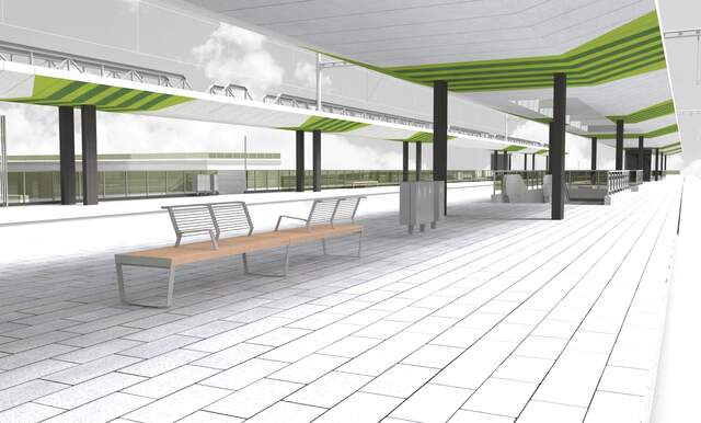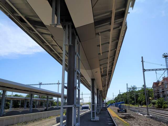 Für diesen Auftrag liefert mmcité+ die Überdachung von drei Bahnsteigen und zwei Unterführungen. Bahnsteige Nr. 2 und 3 sind praktisch fertig und werden im Dezember in den Probebetrieb genommen. Beim Bahnsteig Nr. 1 und den Unterführungsausgängen wird die Verkleidung montiert. Bei der Ausführung der Haltestelle Eden wurde ihre Nähe zum Fußballstadium berücksichtigt. Bei der ganzen Konstruktion wurde hoher Wert auf ihre Beständigkeit gegen mechanische Beschädigung einschließlich der verwendeten Materialien für die Verkleidung gelegt. Die Abfallbehälter, zum Beispiel, sind in die Verkleidung der Tragsäule vollständig integriert.