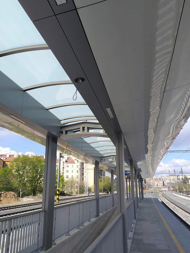 Bei allen drei Projekten besteht die Konstruktion der Überdachung aus zwei Schichten. Für den Dachmantel wurde Profilblech aus Stahl mit einer Antikondensatbeschichtung mit einer nachträglichen Aluzink-Veredelung verwendet. Die ganze Fläche verfügt über eine zusätzliche Polyesterlackbeschichtung. Dadurch konnten wir erzielen, dass die minimale Beständigkeit auch in der korrosionsneigenden Bahnumgebung mindestens 25 Jahre beträgt. Was das Material für die Untersichten angeht, wurden in Eden und Zahradní Město Verbundplatten aus Hochdrucklaminat verwendet. In Vršovice wird die Unterkonstruktion durch gerundete Hochglanz-Verbundplatten aus Aluminium gedeckt.