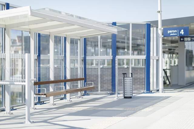 Wir haben ebenfalls die Überdachungen für die Aufzüge und den Unterführungsausgang geliefert, dies alles in der für die polnischen Bahnen typischen farblichen Gestaltung.
