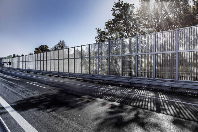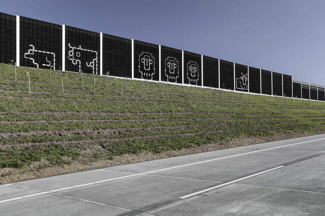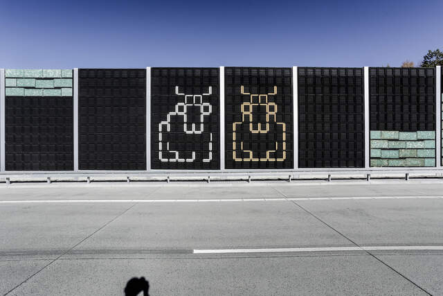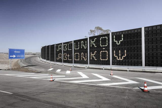 Die Lärmschutzmaßnahmen waren Teil des Baus der Straße I/11 im Abschnitt Nebory - Oldřichovice. Die Paneele tragen das optische Muster Noba digi. Das feine Raster erlaubte es, künstlerisch verarbeitete Navigationselemente an die Wand zu bringen.