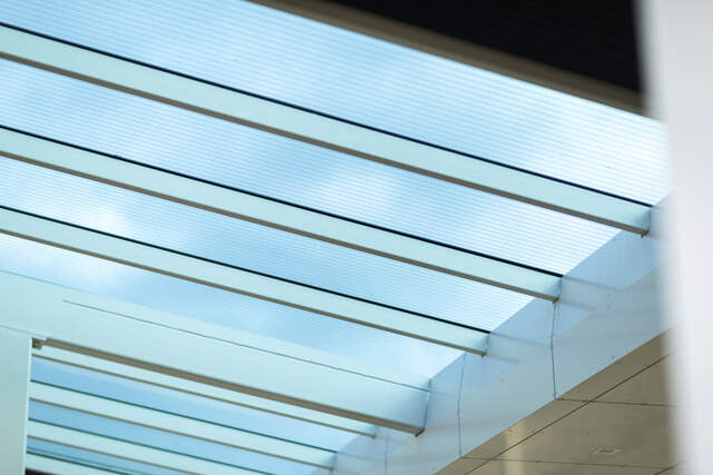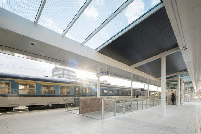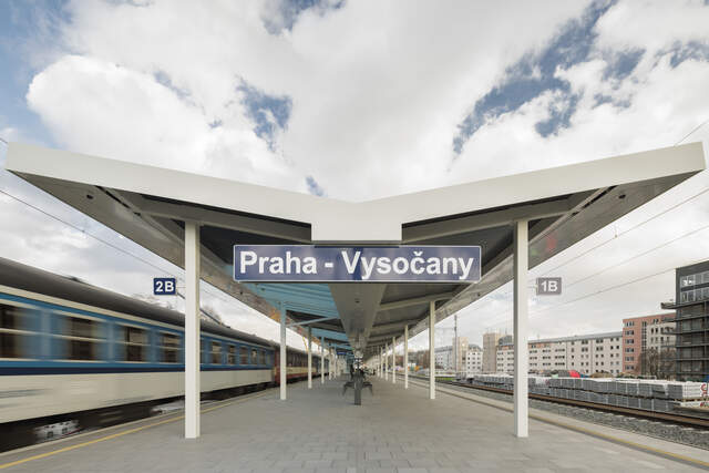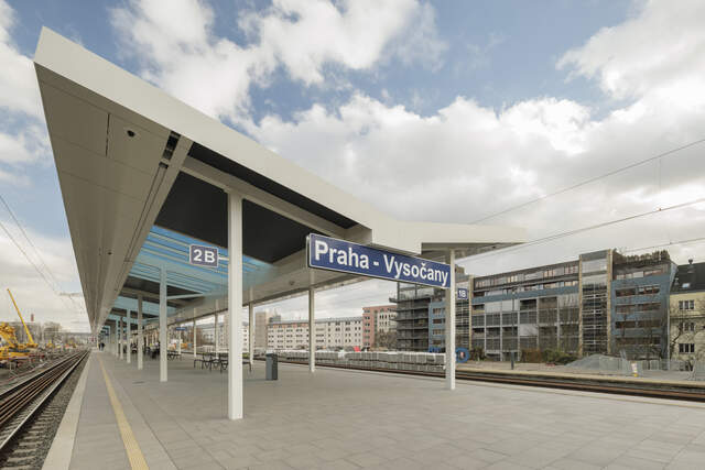 Die Eisenbahnstation Prag-Vysočany unterzieht sich einer komplexen Modernisierung. Dazu gehört auch die Errichtung der Inselbahnsteige. Im Dach wurden Paneele aus getöntem Glas verwendet. Ein Bahnsteig wurde bereits in Betrieb genommen.