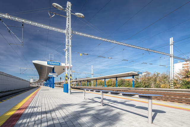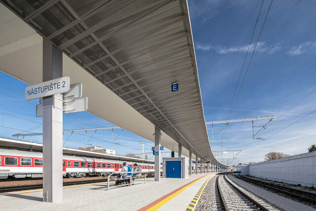 In Trnava haben wir zwei Überdachungsprojekte mit einer Gesamtlänge von über 300 Metern realisiert. Die Konstruktion ist in zwei Teile gegliedert. Durch den Höhenversatz der Dachteile wurde die Masse des Daches geteilt und das Ganze wirkt leicht und elegant. Ein interessantes Merkmal ist die Integration von Leuchten unter Lochblech.