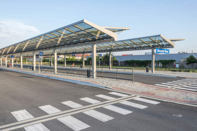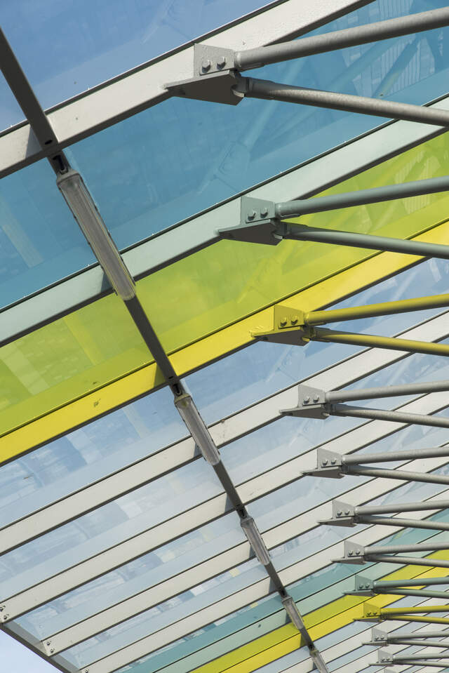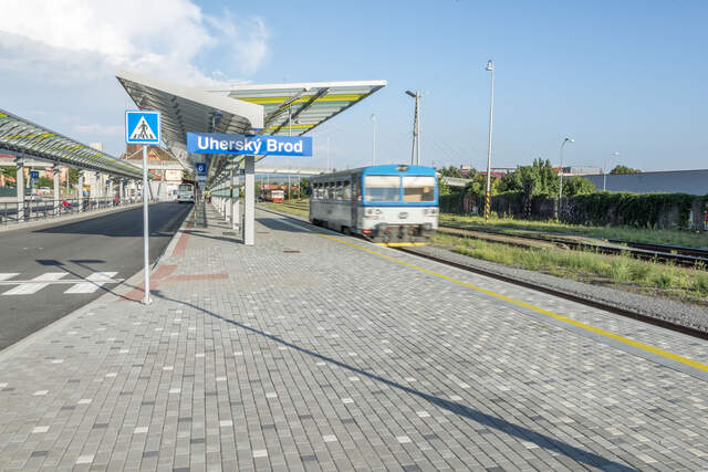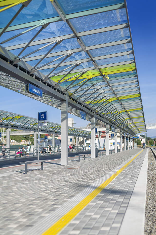 In Uherský Brod haben wir zwei Inselbahnsteige gebaut, einer davon ein reiner Bussteig, der andere grenzt auf einer Seite an die Bahnstrecke. Wir verwendeten eine komplett verglaste Dachhaut, wobei ein Teil abgehängt ist. Als Beschattungselement wird eine farbige Folie verwendet.