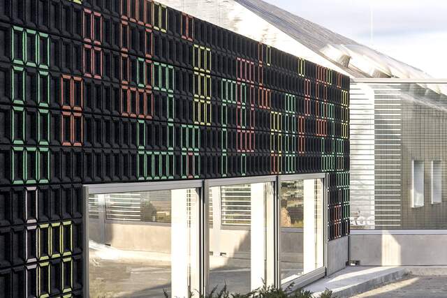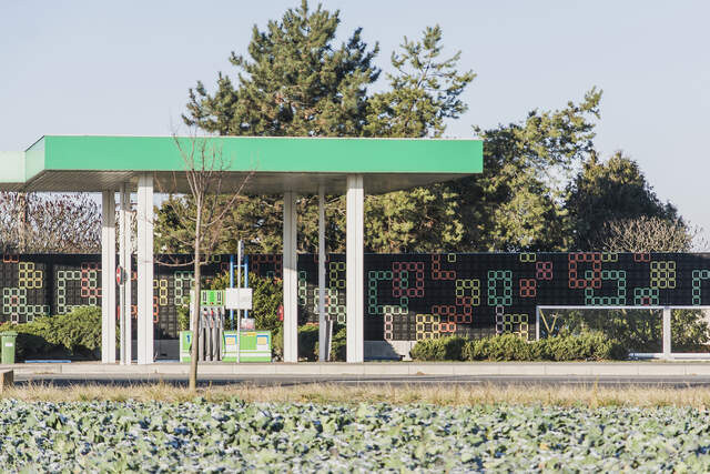 Errichtung einer Lärmschutzwand zwischen dem Egoé-Gelände und der Tankstelle. Es handelt sich um eine Kombination aus absorbierenden Paneelen und Glasscheiben. Für die optische Gestaltung haben die Schüler und Schülerinnen der örtlichen Grundschule Sorge getragen.