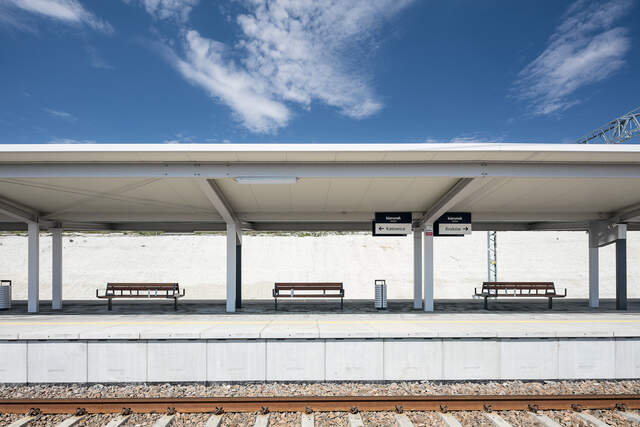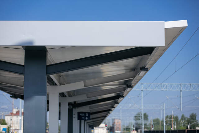 Minimalistisches Konzept. Das ist die beste Charakteristik der Überdachung tree. Das gestalterische Prinzip wird in diesem Fall stark durch die statische Lösung beeinflusst. Die Überdachung zeichnet sich durch ihre Tragkonstruktion aus, die an einen Baum erinnert. Zusammen mit gekröpftem Dach handelt es sich um eine Lösung, die visuelle Dynamik in das Objekt hineinträgt. Als beruhigendes Gegengewicht dient das massive Frontpaneel.