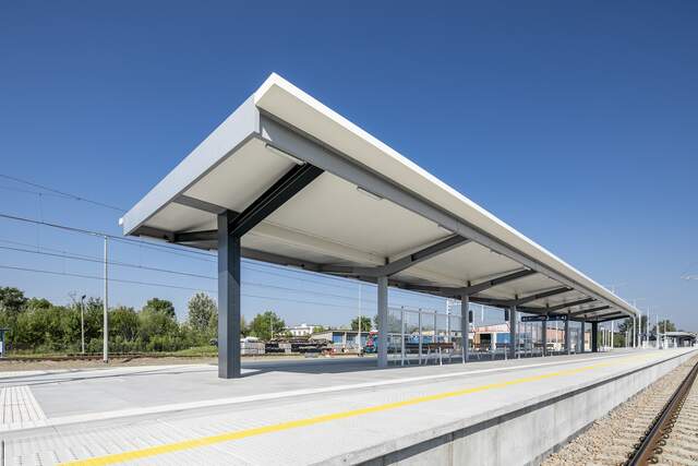 Die Überdachung tree ist stets beidseitig. Alternativ zur klassischen Einordnung kann auch eine Zwei-Säulen Variante verwendet weden. Am Frontpaneel kann der Name der Station angebracht werden. Die erste und letzte Säule ist verkleidet.