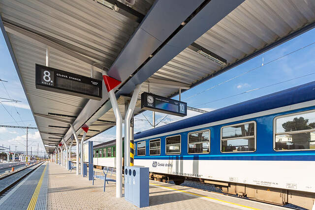Der Farbakzent der Überdachung flago sind dreieckige rote Abdeckungen, welche die Dachentwässerung überdecken. Es handelt sich um rein funktionelle Elemente, die den langen Raum des Bahnsteigs rhythmisieren und optisch verkürzen.