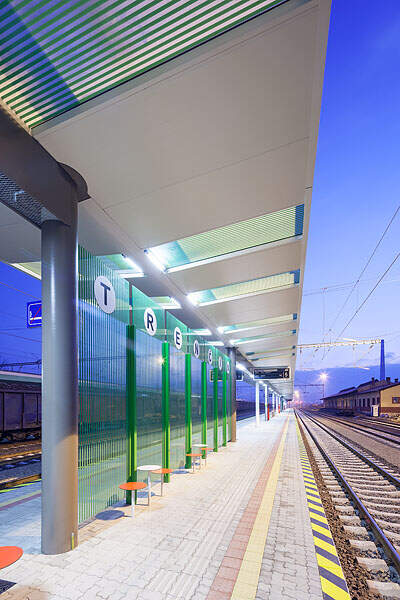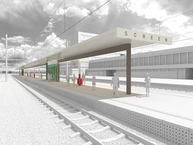 Die Konstruktion screen erachten wir in vielerlei Hinsicht als revolutionär. Zum ersten Mal ist es uns hier gelungen, die Grafik adäquat in die resultierende Gestaltung des Bahnsteigs einzugliedern, den Namen des Bahnhofs in den allgemeinen Grafikstil einzubinden und so einen gesamtheitlichen Raum zu schaffen, welcher mit den Reisenden kommuniziert und sie zu geschützten Plätzen mit angenehmer Atmosphäre leitet.
