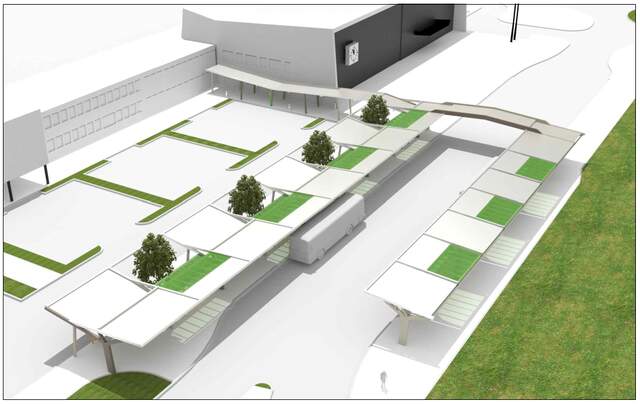 Zadaszenie pięciu podłużnych stanowisk autobusowych i do tego łącznik prowadzący do budynku dworca kolejowego, dostawa małej architektury miejskiej i boksu na rowery.