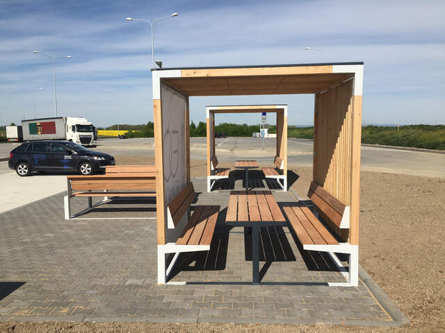 „Jest to pilotażowy projekt. Po obu stronach autostrady zainstalowaliśmy po dwa moduły z ławkami i stołami winkl. Wyposażenie dopełnia jeszcze odkryte siedzisko. Następnie odnieśliśmy sukces w konkursie ogłoszonym przez firmę Čepro, która prowadzi sieć stacji EuroOil”, opowiada szef rozwoju mmcité+ Petr Motáň. Łącznie chodzi o czterdzieści lokalizacji. W niektórych miejscach, na przykład w Napajedlach wszystko jest już gotowe. Całe zamówienie musi zostać zrealizowane najpóźniej w ciągu grudnia.