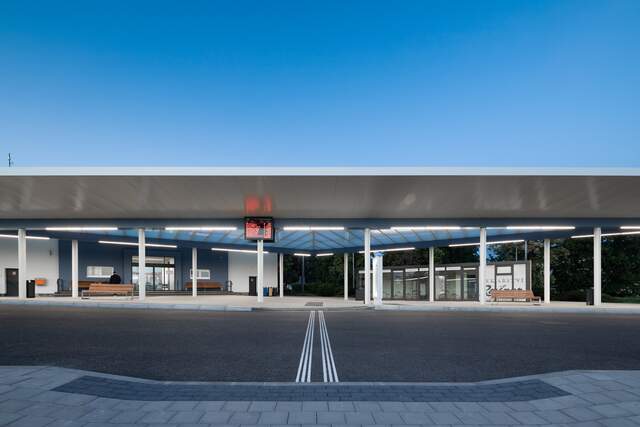 Na peronie wyspowym zastosowaliśmy dla poszczególnych stanowisk łącznie 12 typowych wiat geomere, z Bílovic pochodzi również kompletna mała architektura miejska. Częścią budowli jest także obiekt sprzedażowo-usługowy. Składa się z czterech modułów, które wizualnie łączy między innymi wentylowana fasada z masywnego drewna. A na dodatek, do Vyškova dostarczyliśmy także wiatę na rowery serii gare.