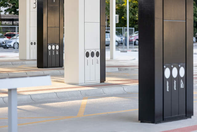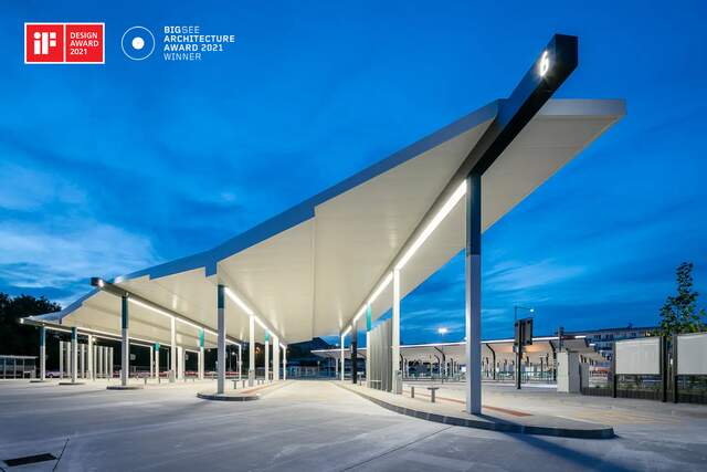 Umieszczenie na przemian ciemnych belek centralnych i białych słupów jest bardzo istotne dla całkowitego wrażenia i odbierania formy konstrukcji. Forma zadaszenia o kształcie równoległoboku, jak również konstrukcja nośna są bardziej skomplikowane, dlatego też kładziono nacisk na prostotę z punktu widzenia stylu plastycznego. Stalowe słupy centralne pokryte są lakierowaną blachą ocynkowaną, zaś konstrukcja nośna dachu ukryta jest całkowicie w suficie podwieszanym, w którym nie widać ani jednej śruby lub nitu. Do ujednolicenia obiektu pod względem wizualnym przyczyniają się również wbudowane kosze i oświetlenie na całej długości belek.