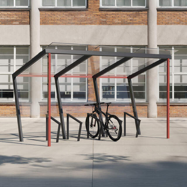 Přístřešek na kola Traxo 3 má kompaktní půdorysné rozměry, jeho kapacita je přitom až deset jízdních kol. Díky tvaru střechy a zadní stěny nabízí maximální ochranu před nepřízní počasí.